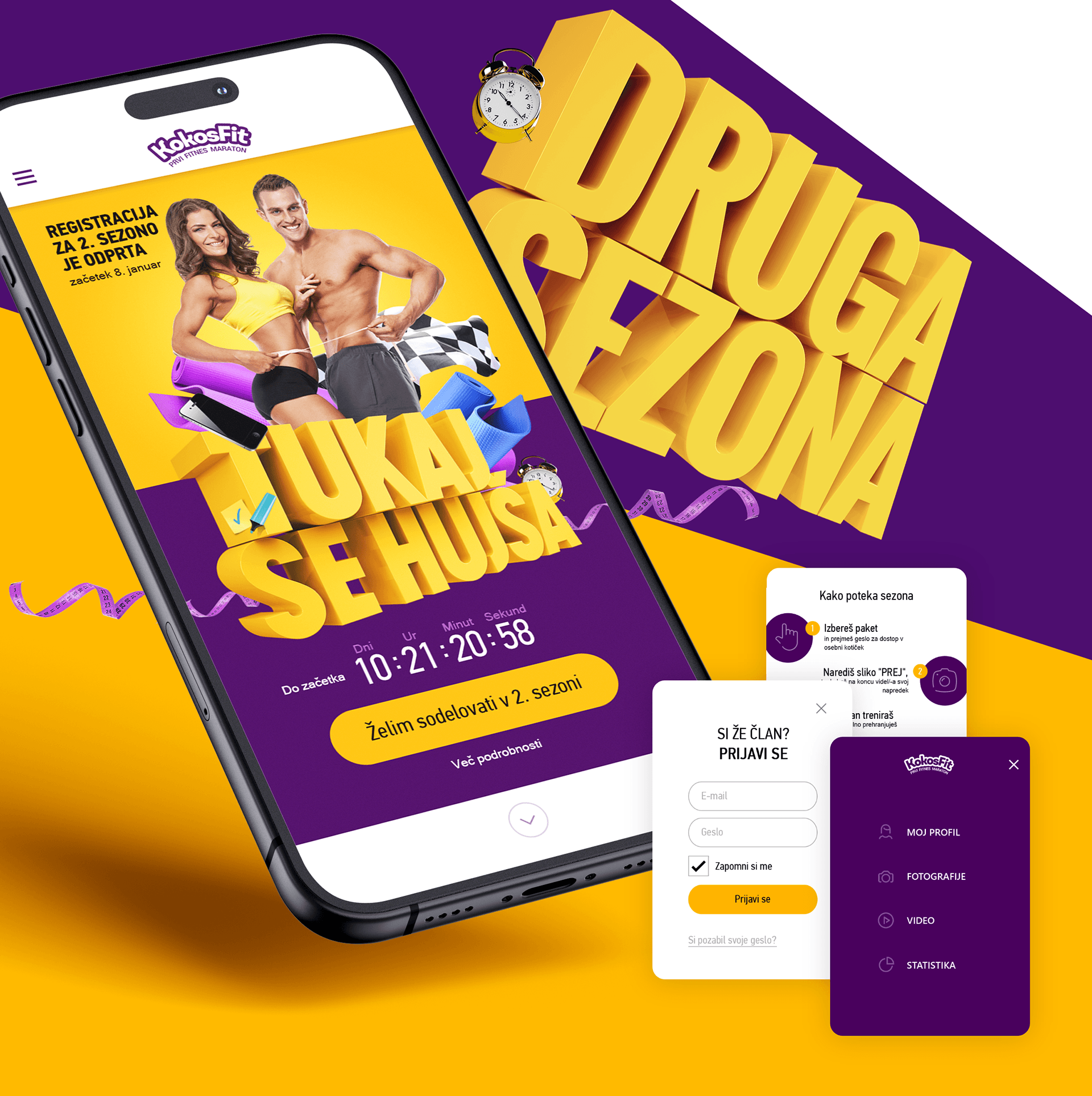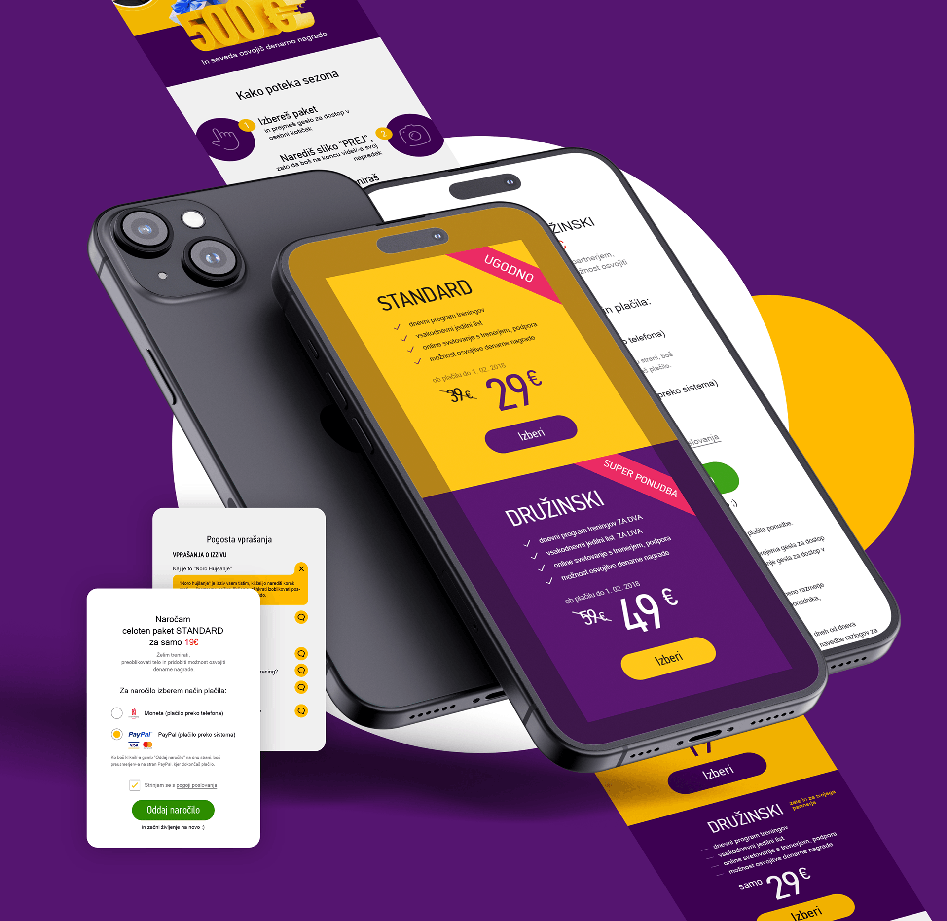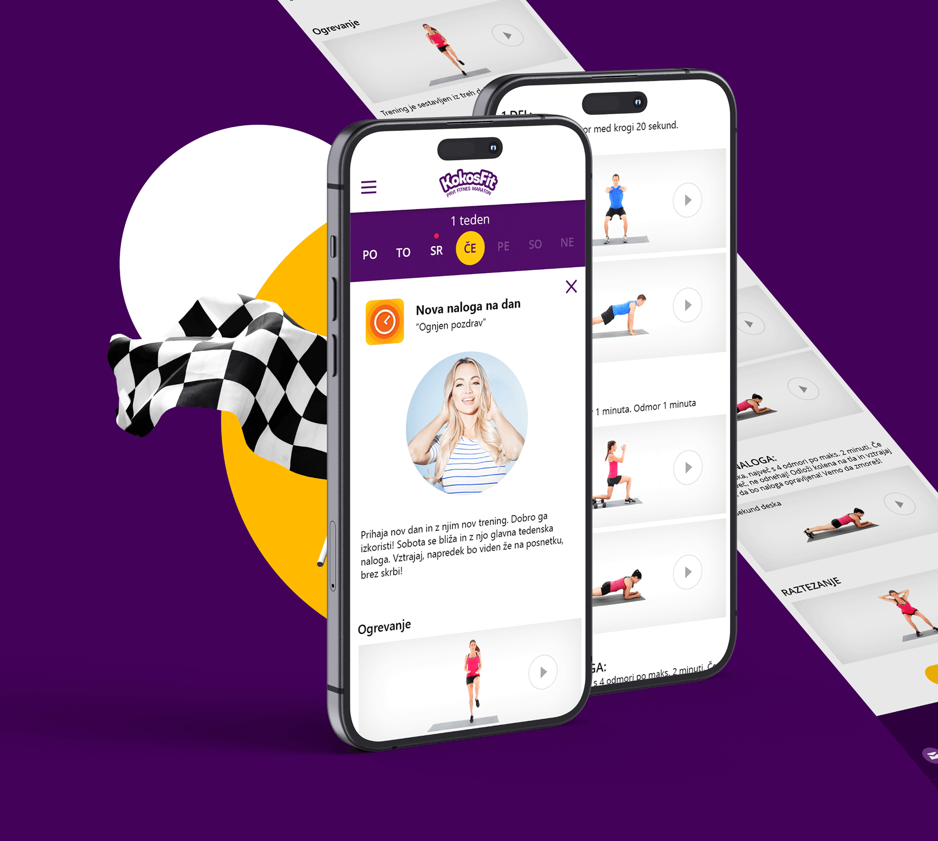 Razviti je bilo treba grafično oblikovanje za mobilno fitnes aplikacijo. Uporabnike aplikacije so aktivni moški in ženske, zato sta bili kot glavni barvi izbrani vijolična in rumena. Vijolična je povezana z moško podzavestjo, rumena pa z žensko. Pisava, ozadje, barva gumbov, besedilo - vse je bilo skrbno analizirano in izbrano tako, da bi uporabniki udobno delali v aplikaciji dlje časa.