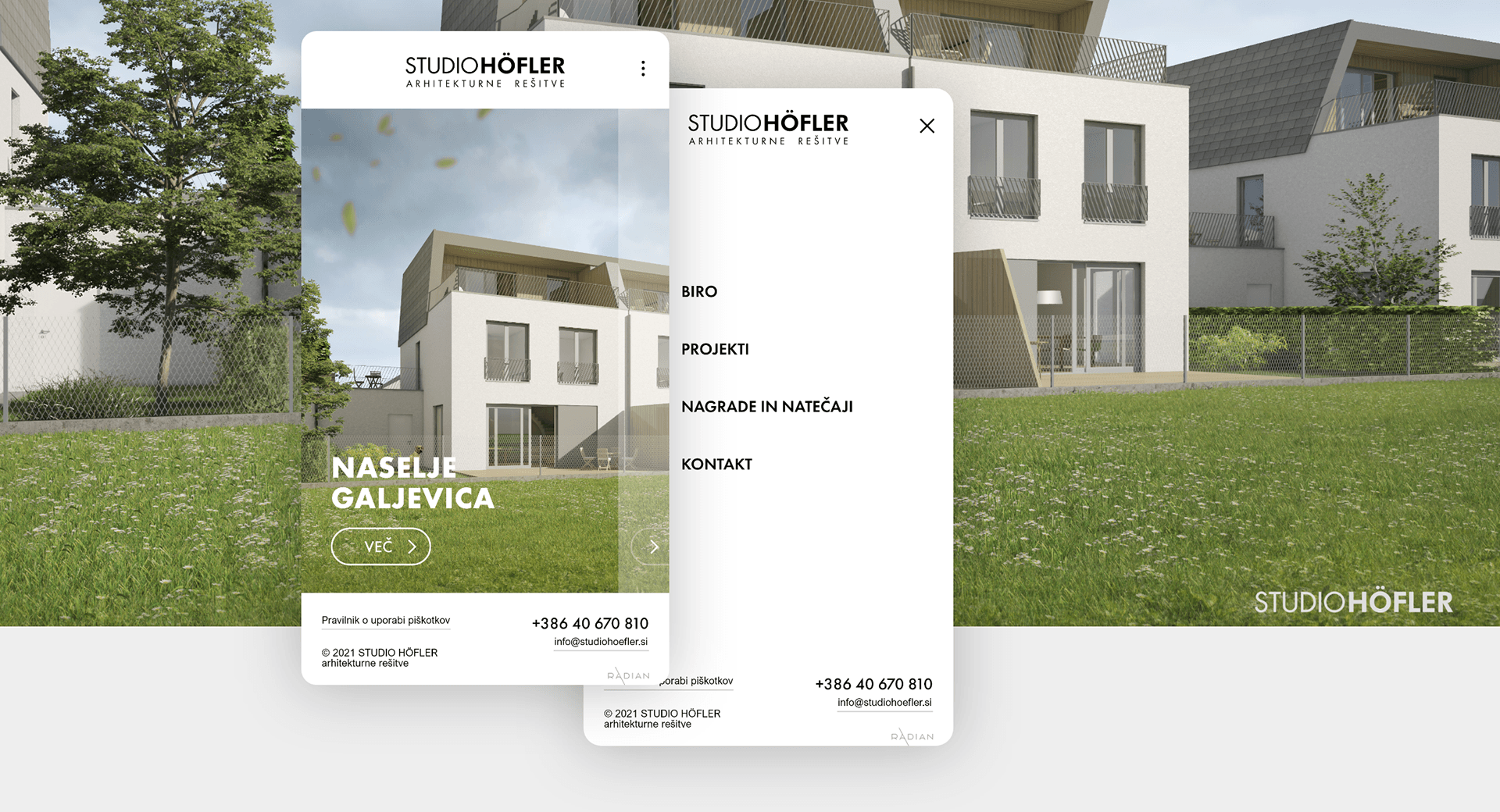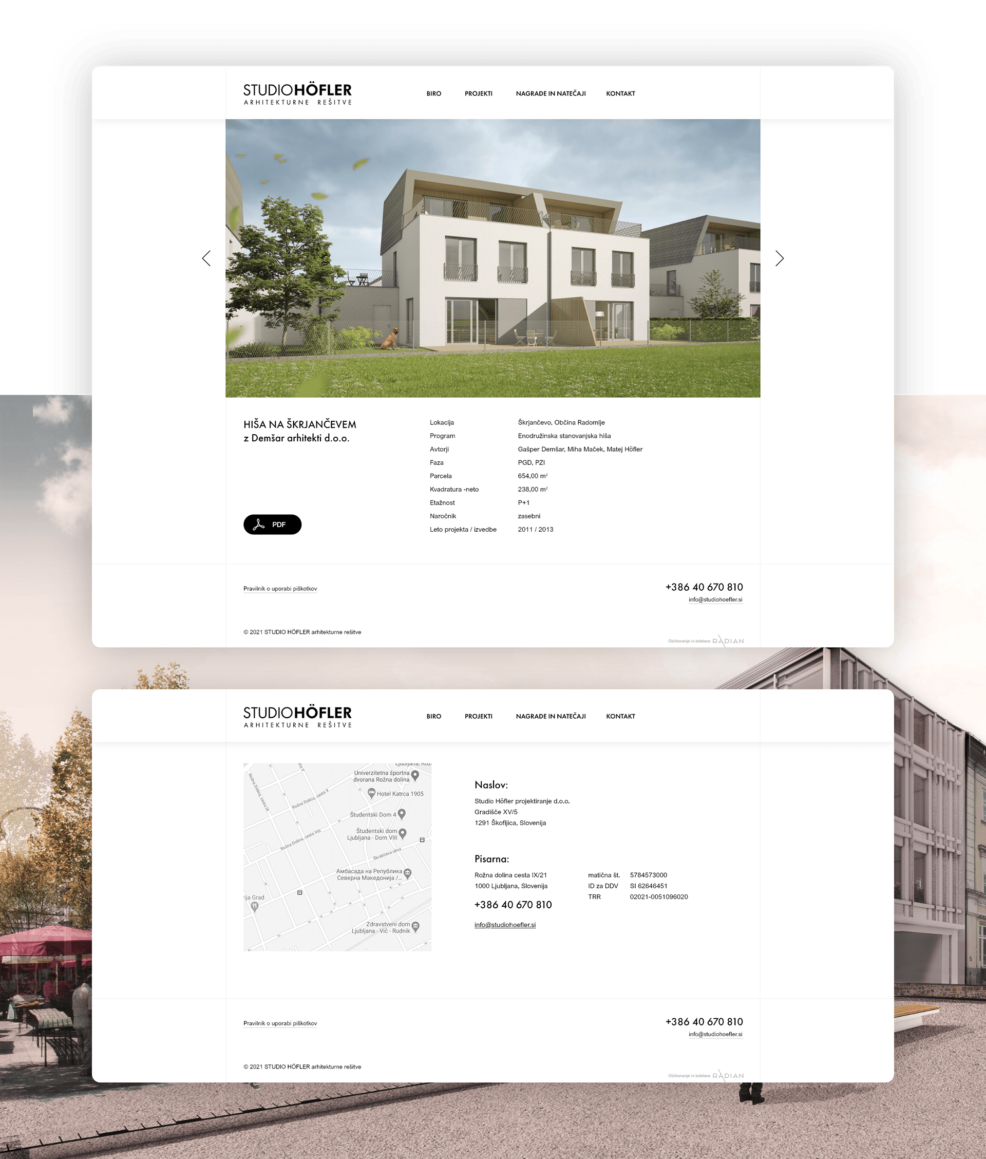 Namen spletnega mesta za arhitekturni biro v Ljubljani je predstavitev projektov. Zato je njegova struktura maksimalno preprosta ter osredotočena na predstavitev opravljenega dela. Glavna stran vsebuje meni za prehod na podstrani in pasico z informacijami ob enem od nedavnih projektov z možnostjo prehoda na stran s podrobnim opisom.